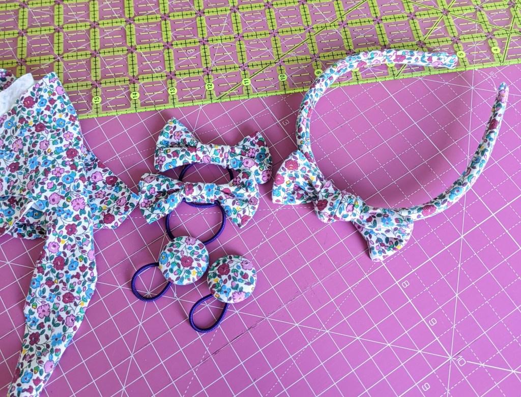 I’ve discovered that some fabrics and patterns work better for different items with some suiting hair bands and bows better and others fabrics have suited bobbles better. Some fabrics have worked well with everything and I have been able to create some nice matching sets. These matching sets have worked especially well if the parent has bought the next size up of clothes to go with the hair accessories. My daughter, of course, prefers more of an eclectic mix of clothes and hair bobbles!